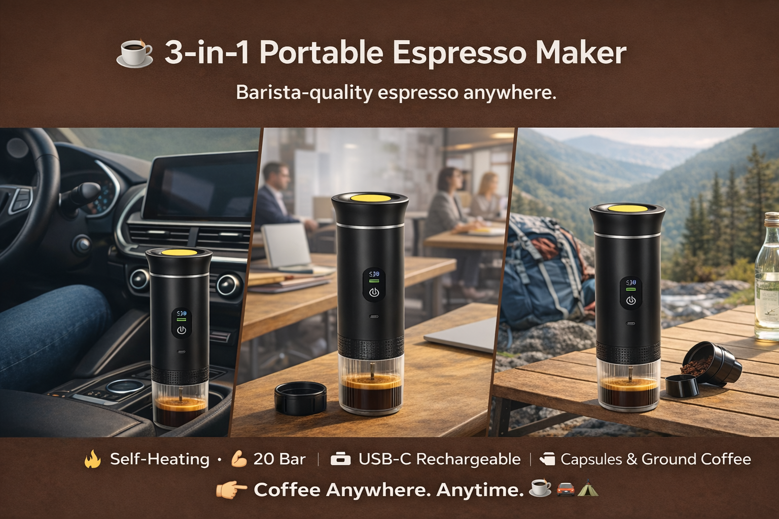 ☕ 3-in-1 Portable Espresso Maker🔥 Self-Heating • 💪 20 Bar🔋 USB-C Rechargeable • ☕ Capsules & Ground Coffee🎒 Perfect for Home, Car & Outdoor